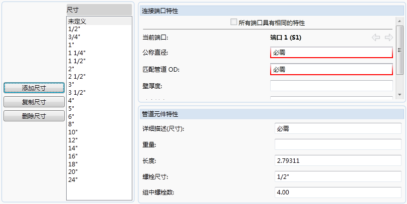 - 在“连接端口特性”下的“公称直径”框中,输入公称直径(例如:1)。