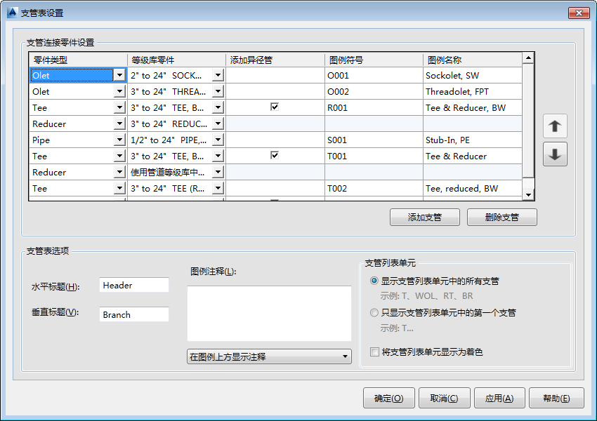 定义在支管表中使用的管件,也可以设置支管表的显示选项。