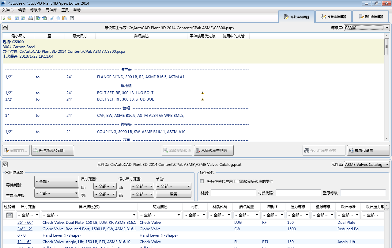 使用等级库编辑器,可以从元件库添加零件以创建等级库工作表,然后可以指定针对特定管道尺寸布线时要使用的管件。