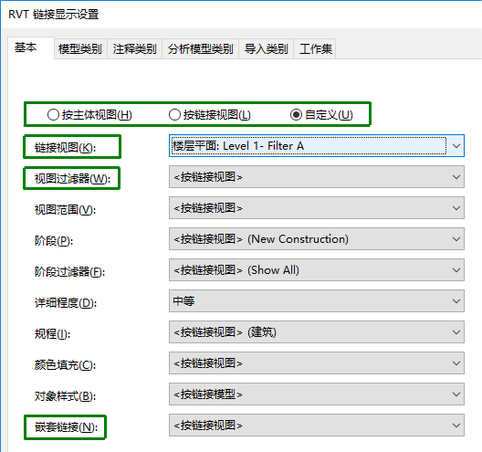 要控制主体视图中针对链接模型的过滤器的使用,请使用“RVT 链接显示设置”对话框中的设置。
