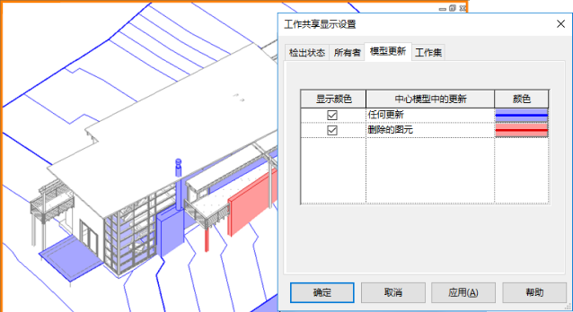 您可以直观地区分工作共享模型中的哪些图元已在中心模型中更新或者从中心模型中删除。