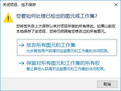 该选项会放弃您对本地模型所做的任何修改。 这对于您上次保存到本地模型的修改没有任何影响。 该选项将本地模型回退到上次保存时的状态,并显示“关闭项目,但不保存”对话框。