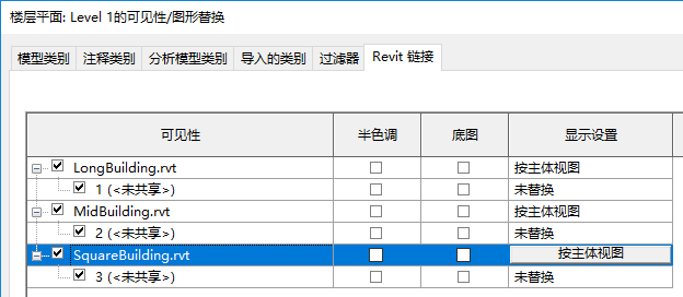 “可见性/图形”对话框中的“Revit 链接”选项卡包含以下各列: