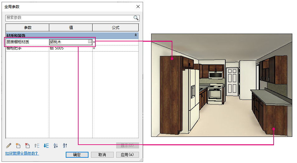(全局参数)。选择其他材质,它将应用于厨房中的橱柜。不再需要分别修改每个族的类型参数。