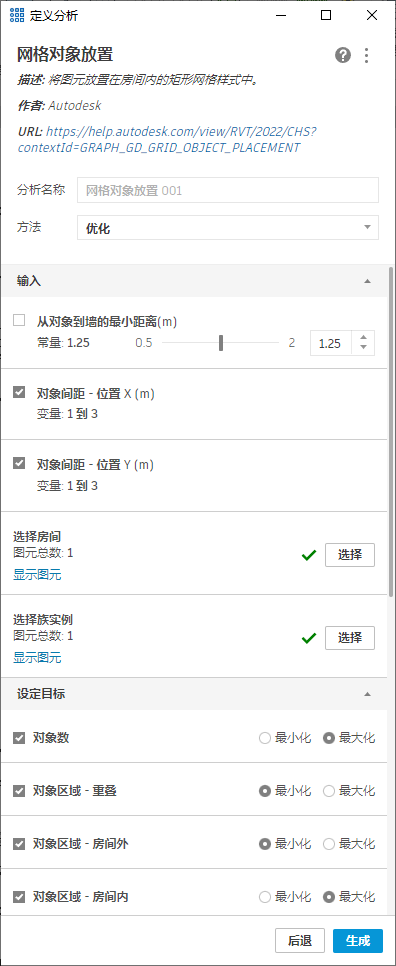 在对话框的底部,使用散点图查找符合条件的结果。在此示例中,栅格间距需要大于 1.6 米,以符合物理距离准则。较低的值会放置更多的桌子,但它们靠得太近,无法满足准则。较大的间距会放置更少的桌子,无法满足餐馆财务上的可行性。总体目标是在桌子数和桌子之间的物理距离之间取得平衡。