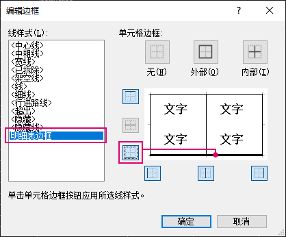 (边框)。在“编辑边框”对话框中,选择线样式,然后单击将应用线样式的位置按钮。在此示例中,将仅向底部边框指定较宽的线样式。
