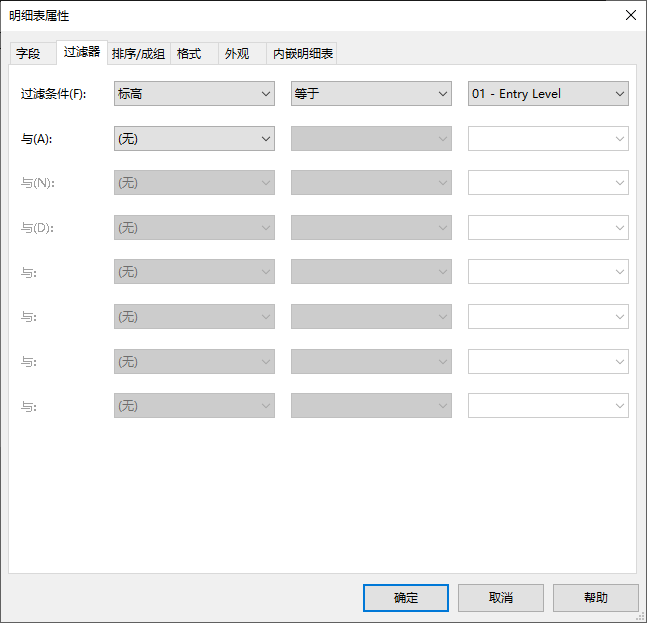 “标高”参数需要包含在明细表中,过滤器才能工作,但无需显式。在功能区上单击“隐藏”