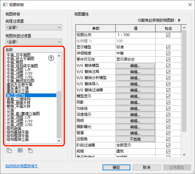 将模板属性应用于当前视图 - 选择一个模板,然后将其可见性设置应用于当前视图。