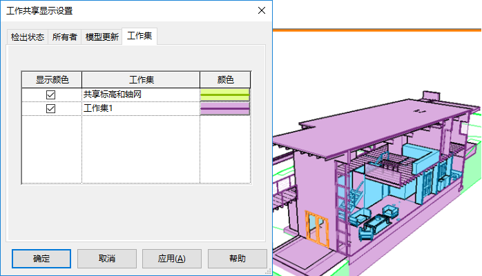 通过使用工作共享显示模式,可以查看工作共享模型中不同图元的状态。