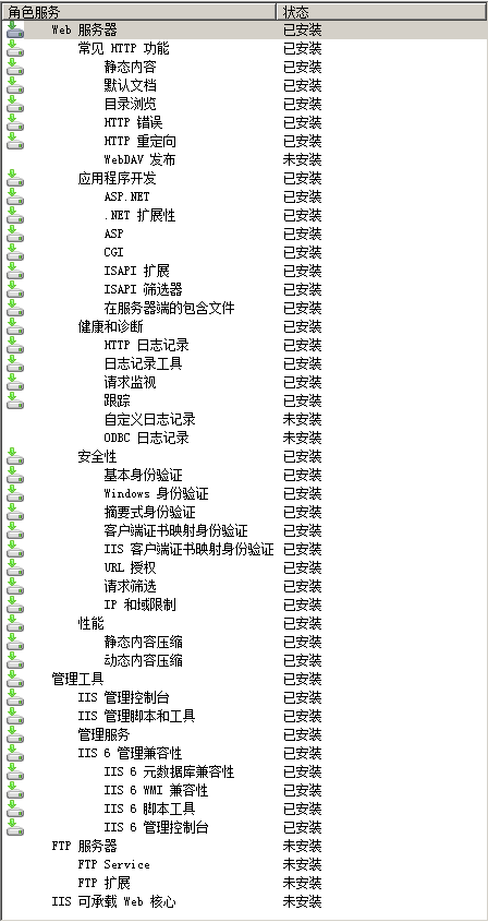 - 向下滚动到“角色服务”,并确认以下角色服务已安装: