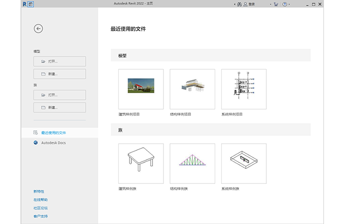 Revit 主页还显示了现代化视觉样式以匹配 Autodesk 标准,它具有优化的信息架构,如内容链接、刷新按钮和 Autodesk Docs 接入。