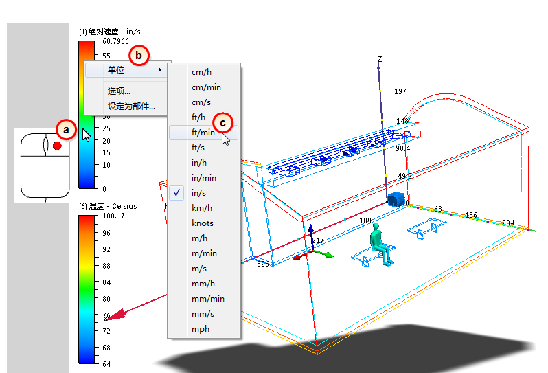 在此步骤中,我们将使用等值面查看流量和温度。等值面非常有用,可显示模型中选定的结果量值(空气速度、温度等)相同的所有区域。它们甚至可以按照不同的量进行着色,以深入揭示两个量(如空气速度和温度)之间的关系。
