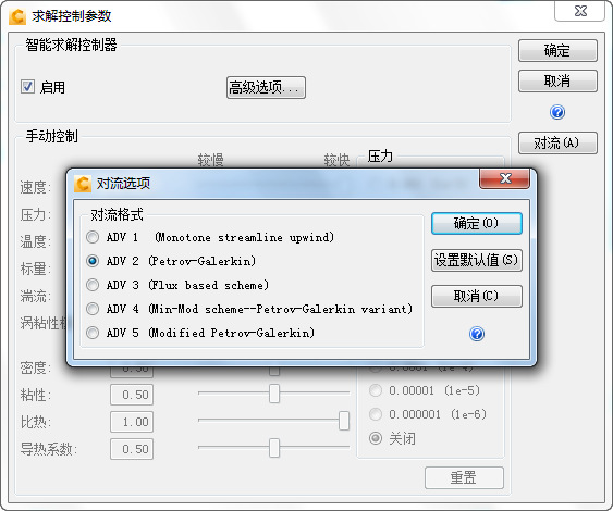 在“求解”对话框中,单击“求解控制”,然后单击“对流”。在“对流选项“对话框上,选择对流格式2。单击确定,然后在“求解控制”对话框上单击确定。