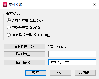 產生「AutoCAD 圖面交換檔」格式的子集,其中只含有圖塊參考、屬性,以及序列結束物件。DXF ™ 格式萃取不需要樣板。副檔名。dxx 可從一般的 DXF 檔中區分出輸出檔。