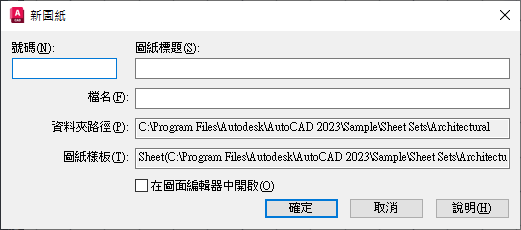 指定圖紙號碼。建議您第一次建立圖紙時,不要填寫圖紙號碼。依預設,新圖紙的圖面名稱和配置名稱將為圖紙號碼及圖紙標題。