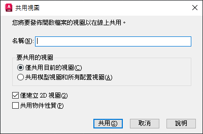 命名共用視圖。該名稱最多可包括 255 個字元,並可包括字母、數字、空格以及任何未被作業系統或此程式用於其他用途的特殊字元。