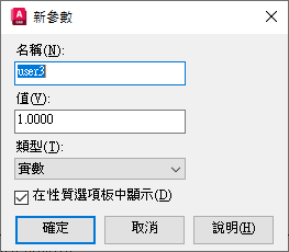 指定是否將使用者參數做為一個性質顯示在圖塊參考的「性質」選項板中。