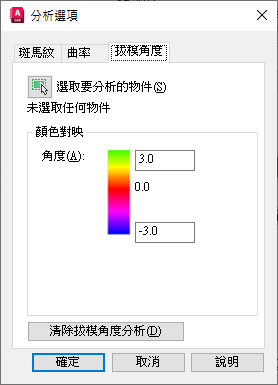 將綠色對映至最大拔模角度,紅色對映至中拔模角度,藍色對映至最小拔模角度。