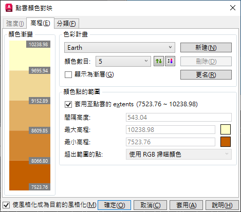 展示將套用至點雲的顏色值範圍。您可以在此處按一下要變更的顏色。