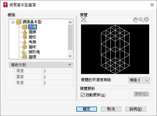 指定要修改的網面基本型。選取要在「鑲嵌分割」下顯示其設定的基本型類型 (例如「方塊」或「圓錐」)。