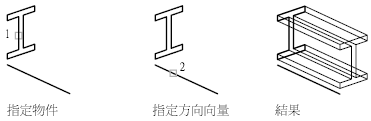 此方法可將網面建立成沿著指定路徑走向的一系列平行多邊形。必須已繪製原始物件和方向向量,如下圖所示。