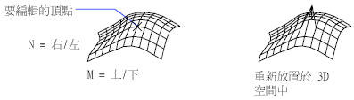 編輯多邊形網面的個別頂點,其中多邊形網面可視為矩形 M × N 陣列,其中 M 與 N 是在 3DMESH 中指定的方向。SURFTAB1 系統變數 SURFTAB1 與系統變數 SURFTAB2 儲存 RULESURF、TABSURF、REVSURF 與 EDGESURF 指令的 M 與 N 值。
