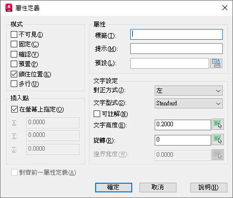 設定屬性文字的對正方式、型式、高度以及旋轉角度。