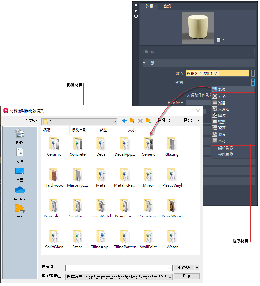 產品提供的影像的資源庫,您可以與材質一同使用。您也可以使用以下檔案類型加入自己的材質: