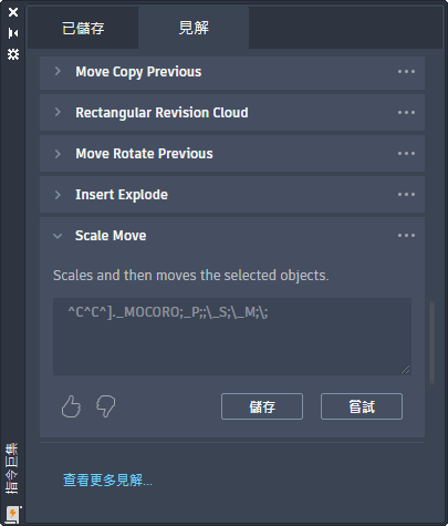 註: 某些關聯的指令巨集包含可讓您嘗試該見解的預設值。這些預設值會在描述後面以註解方式帶出。將巨集加入「已儲存」頁籤後,您可以使用「在 CUI 中編輯」選項在