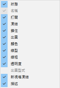 依名稱列示所有欄。勾選標記表示該欄會包含在顯示中。按一下欄名稱以顯示或隱藏欄。僅當配置視埠處於作用中時,可以使用視埠凍結、視埠顏色、視埠線型、視埠線粗以及視埠出圖型式。