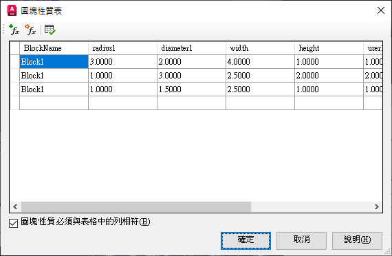 您可以按 Shift+Enter,以在「圖塊性質表」對話方塊中的格線中,為多行屬性值加入新行。
