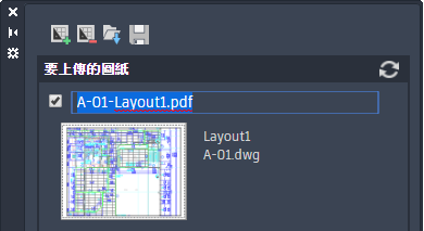 開啟「推送到 Autodesk Docs」選項板,您可以在其中選取 AutoCAD 配置,以 PDF 格式上傳到 Autodesk Docs。