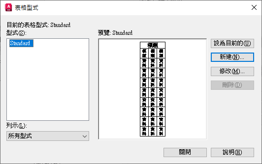 刪除在「型式」清單中選取的表格型式。但無法刪除圖面中正在使用的型式。