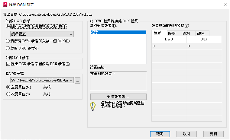 標準為預設對映設置,其從正匯出的圖面中萃取資料並將自動對映套用至 DGN 圖層、線型、線粗和顏色,如對映預覽所示。