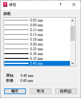 顯示先前的線粗。建立圖層時指定的預設線粗是 DEFAULT (按預設值 0.01 英吋或 0.25 mm 出圖)。(系統變數 LWDEFAULT)