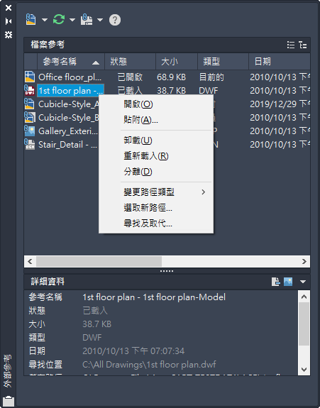 如果您選取的要編輯的參考已貼附外部參考或圖塊定義,則在「參考編輯」對話方塊中會顯示此參考及其巢狀式參考,並可以選取它們。只有在選取的選擇物件是套疊參考的一部分時,套疊參考才會顯示出來。一次只能選取一個參考來編輯。如果您在編輯含有 OLE 物件的參考,將顯示 OLE 物件,但無法選取它們進行編輯。