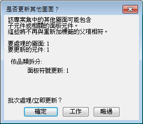 螢幕將顯示「是否更新其他圖面?」對話方塊。該對話方塊會發出警示,指出專案集中的其他圖面包括子元件或相關的面板元件。