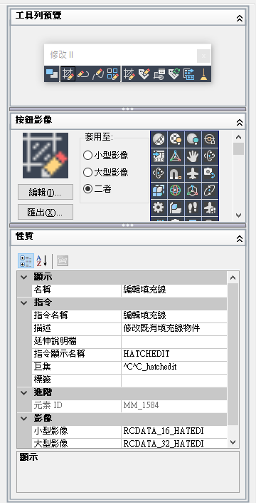 「動態顯示」窗格顯示在「自訂位置」窗格選取的使用者介面元素預覽。它可讓您編輯在「指令清單」窗格中選取的指令影像,以及在「自訂位置」或「指令清單」窗格中選取之項目所特定的性質。