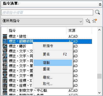 - 在「自訂」頁籤的「指令清單」窗格中,尋找您要複製的指令。
