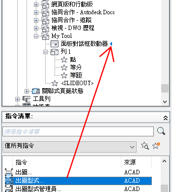 - 將指令從「指令」清單拖曳至面板上的「面板對話方塊啟動器」。
