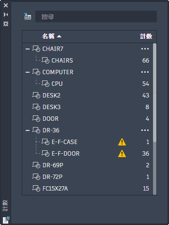COUNTLIST - 開啟「計數」選項板,以檢視和管理計算的圖塊。