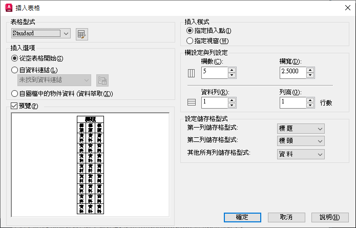 指定表格的大小與位置。您可以使用指向設備或於指令提示下輸入座標值。選取了此選項時,欄數與列數、欄寬與列高均取決於視窗的大小及欄與列的設定。