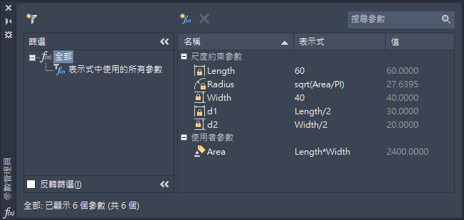 Length 和 Width 尺度約束參數設定為常數。d1 和 d2 約束是參考 Length 和 Width 的簡單表示式。Radius 尺度約束參數設定為包括平方根函數、確定作業優先順序的括號、Area 使用者變數、除法運算子和常數 PI 的表示式。這些參數均在可「參數管理員」中存取。