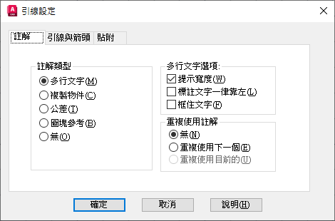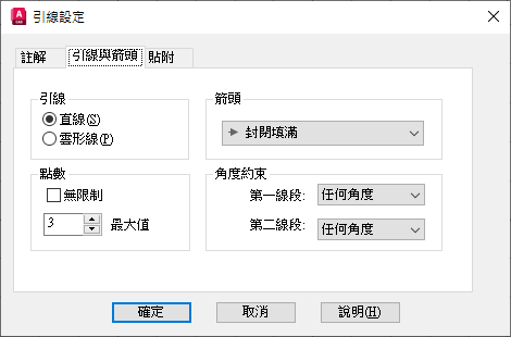 「引線設定」對話方塊包括以下頁籤:「註解」、「引線與箭頭」、「貼附」