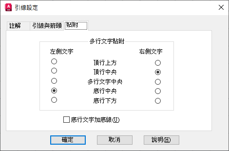設定引線和多行文字註解的貼附位置。只有在「註解」頁籤上選取了「多行文字」,這個頁籤才能使用。