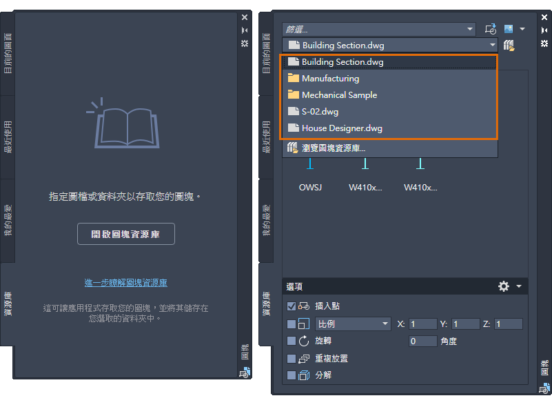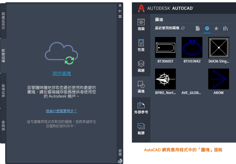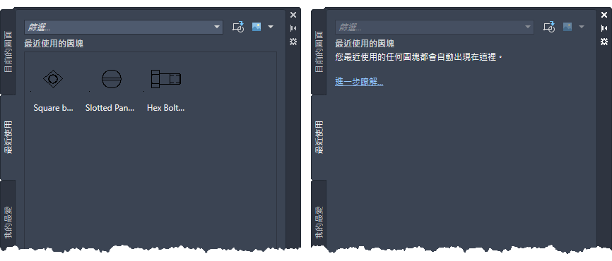「圖塊」選項板已增強,可讓您隨時隨地更方便地存取圖塊。