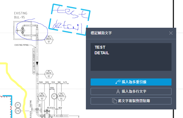 「標記輔助」會自動將標記識別為文字、引線和修訂雲形。按一下識別的標記,然後插入為多行文字、多重引線或修訂雲形物件。您可以在插入文字之前對其進行編輯,或選擇將文字複製到剪貼簿。