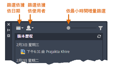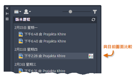在新「圖面歷程」選項板中檢視儲存在雲端的圖面版本歷程,您可以在其中將這些版本與目前版本的圖面進行比較。