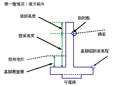貼附點根據擋土牆處於挖方情況還是填方條件而有所不同。如果其在填方中,則貼附點將位於擋土牆頂部附近。如果其在挖方中,則貼附點將位於基腳附近。