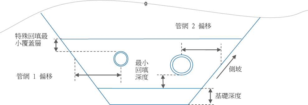 在這兩種情況下,次組合均將根據指定管網中的管位置確定溝渠底部的深度和溝渠寬度。透過測量與取樣橫斷面處的最高管中心線的距離,確定特殊回填最小覆蓋層。透過測量與取樣樁號處的最低管底端外徑的距離,確定特殊回填最小深度。